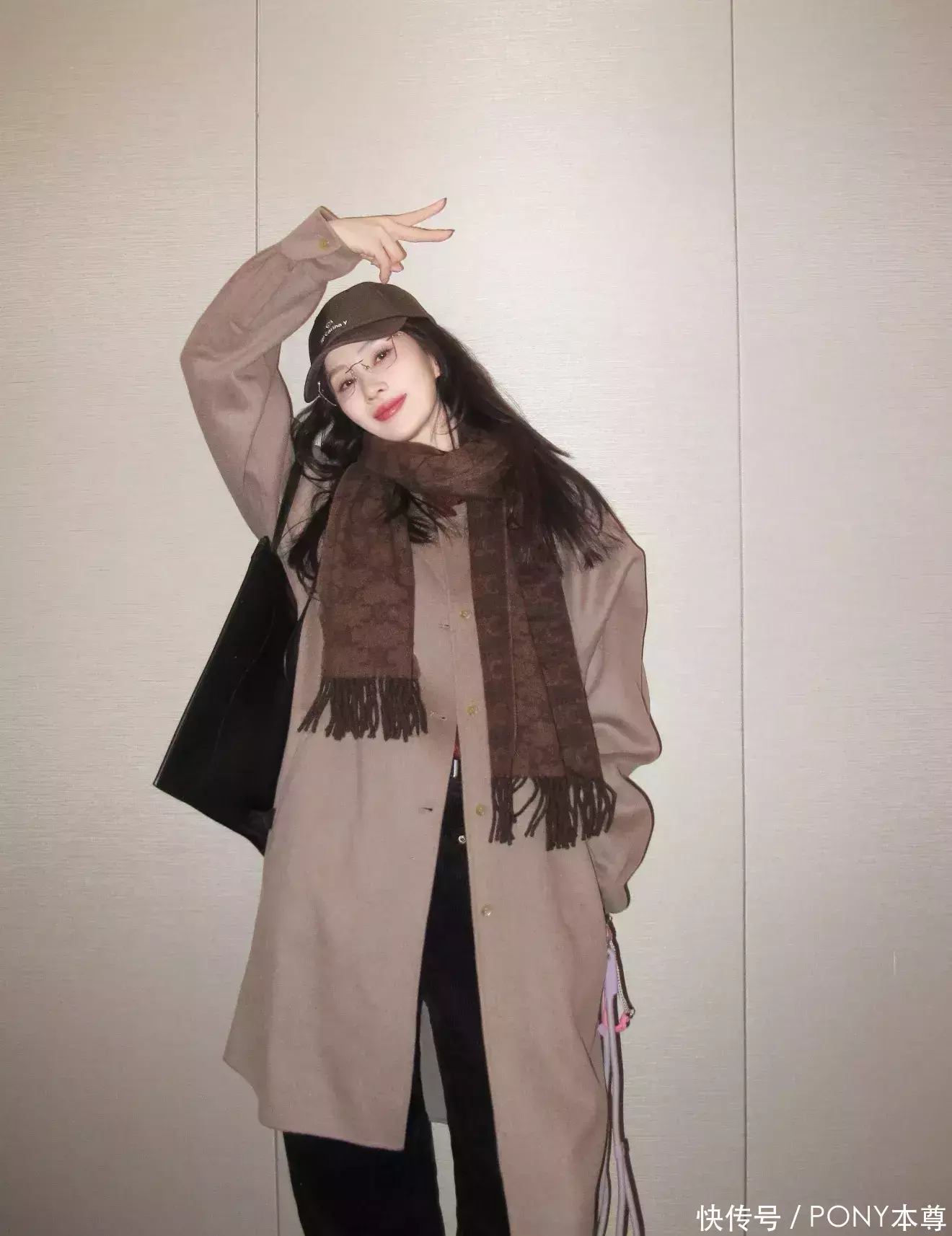 刘诗诗身穿一件H型驼色大衣外套,中长款大衣显身材显高级,下半身搭配黑色直筒牛仔裤,在配饰上,佩戴棕色印花围巾和金丝边框眼镜,美得毫不费力!